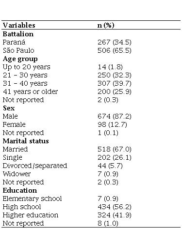 A total of 773 military police officers participated in the study, 506 (65.5%) belonging to the CPI-5/SP and 267 (34.5%) to the 3rd BPM/PR. Police officers’ mean age was 34.5 years (standard deviation: ±7.8 years), with a predominance of professionals aged between 31 and 40 years (39.7%). There was also a higher frequency of male police officers (87.2%), married (67.0%) and with high school (56.2%) (Table 1).