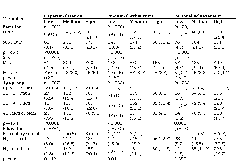 In relation to burnout dimensions, there was a predominance of professionals with a high level of DP (21.3%) among military police officers from the 3rd BPM/PR and a predominance of professionals with a medium level of DP (7 to 12 points) among military police officers from the CPI-5/SP (33.9%), in addition to predominance of police officers with a medium level of EE (17 to 26 points) in both corporations (3rd BPM/PR: 15.5%; CPI-5/SP: 35.2%) and predominance of police officers with a high level of PA (≤ 31 points) in both corporations (3rd BPM/PR: 28.4%; CPI-5/SP: 39.1%). It was also observed a predominance of police officers aged between 31 and 40 years old with medium levels (7 to 12 points) of DP (22.0%) and EE (17 to 26 points) (21.1%) and high level (≤ 31 points) of PA (29.7%), and a predominance of police officers with high school and a medium level of EE (17 to 26 points) (28.2%) (Table 2).