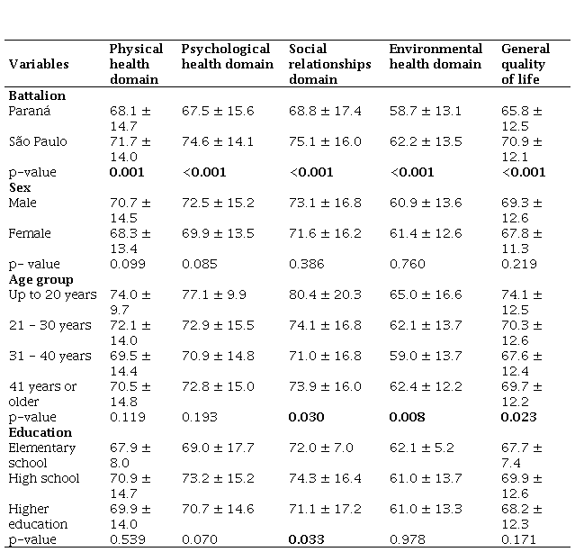 As shown in Table 3, military police officers from the CPI-5/SP had significantly better quality of life levels than police officers from the 3rd BPM/PR in all WHOQOL-Bref domains (p<0.001); there was no statistically significant difference between male and female police officers (p>0.05); younger police officers had better quality of life scores in social relationships (p=0.030), environmental health (p=0.008) and general quality of life (p=0.023) domains; and police officers with higher education had a lower quality of life score in the social relationships domain (p=0.033) than police officers with less education.