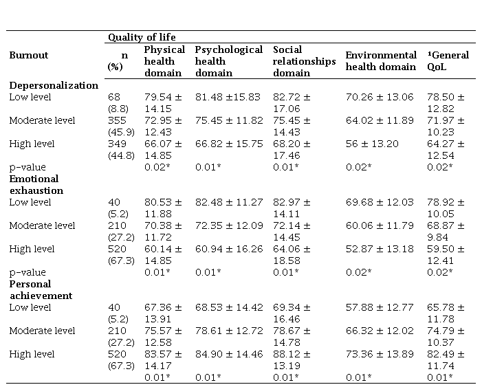The comparison of quality of life scores with the levels of EE, DP and PA was performed using the ANOVA test. Pearson’s correlation test was applied to verify the degree of relationship between the WHOQOL-Bref domains and the MBI domains. A confidence level of 5% (p≤0.05) was considered.
