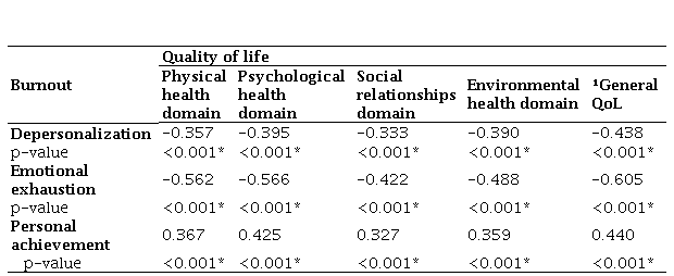 As shown in Table 5, a weak, negative and significant correlation was identified between the DP dimension and the physical health, psychological health, social relationships and environmental health domains, and a moderate, negative and significant correlation between DP and general quality of life. EE showed a moderate, negative and significant correlation with all quality of life domains (physical health, psychological health, social relationships and environmental health) and with general quality of life. PA showed a positive and significant correlation with all quality of life domains, with a weak correlation with the physical health, social relationships and environmental health domains and moderate with the psychological health domain and general quality of life.