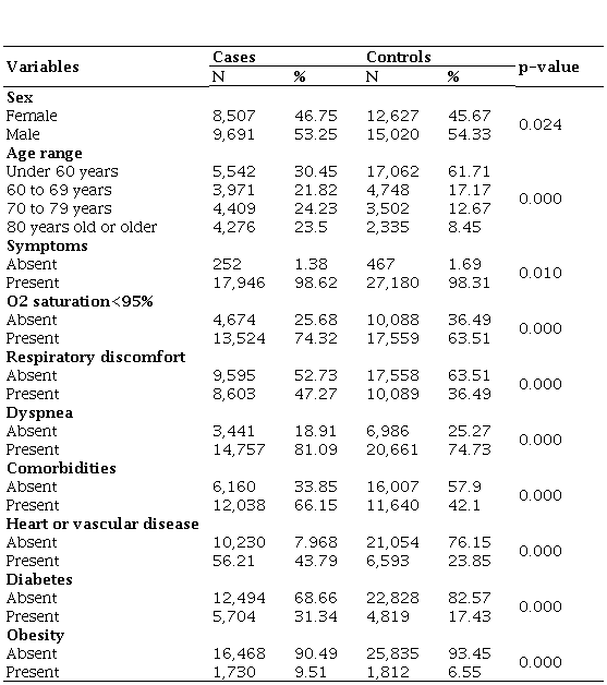 In relation to symptoms, the results indicate that they were present in almost all individuals. In cases and controls, the proportion was higher than 98%. When analyzing the presence of symptoms (O2 saturation <95%, respiratory discomfort and dyspnea), it is noted that cases presented a higher proportion than controls (Table 1).