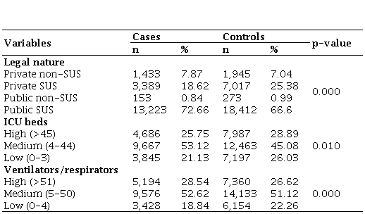 Regarding the number of ventilators/respirators, similar results were observed. The value considered average (5 to 50 ventilators/respirators) was the category that presented the highest proportion of cases and controls, equivalent to 52.62% and 51.12%, respectively (Table 2).