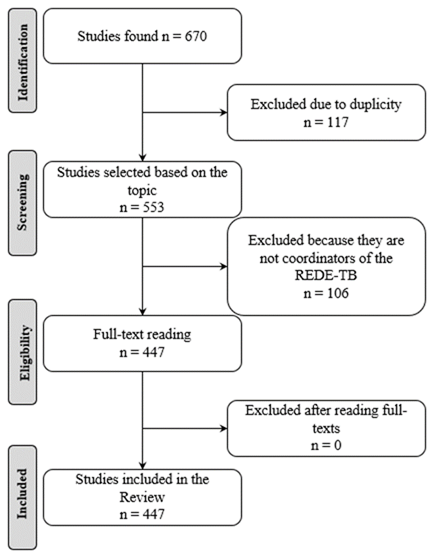 After identifying the researchers linked to REDE-TB, a review was carried out. A total of 670 publications were identified, of which 117 were excluded for being duplicates and another 106 for not having REDE-TB members as authors, 447 publications were included in this review (Figure 1).