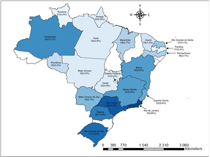 Of the studies carried out, 224 (50.11%) were conducted in some Brazilian state. Rio de Janeiro was the state where most of the studies were carried out (65 - 29.0%), followed by São Paulo (43 - 19.2%), Rio Grande do Sul (31 - 13.8%), Paraná (26 - 11.6%) and Amazonas (24 - 10.7%), (Figure 2). It is important to note that some of the studies analyzed were carried out in more than one location within the states. For this reason, the number of 308 shown on the map (Figure 2) refers to the specific locations within the states where these studies were carried out. With this, it was possible to verify the scope of studies at a national level.