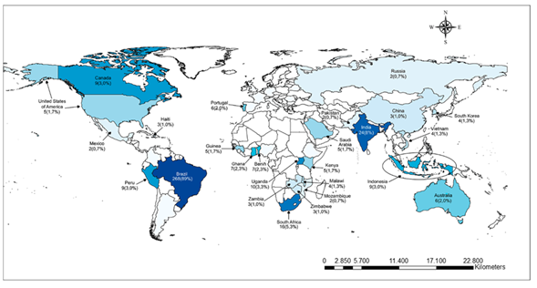 Caption: *Countries with one study each have not been marked on the map. They are: Argentina, Belarus, Bulgaria, Colombia, Ethiopia, France, Gambia, Georgia, Guinea-Bissau, Germany, Italy, Nigeria, Papua New Guinea, Romania, Sierra Leone, Singapore, Spain. More than one country was covered in some studies, which is why the cumulative percentage exceeds 100%; 146 studies were not considered in this analysis because they did not mention this variable or because this variable did not apply to the study in question.