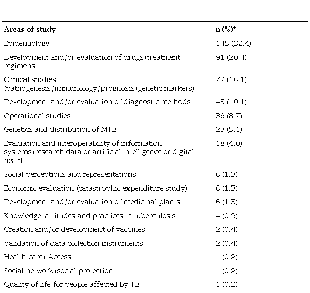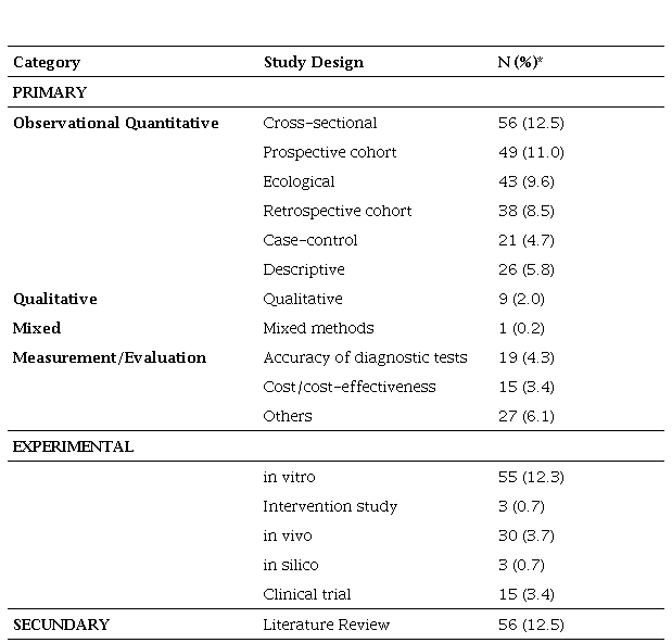 As for the area of approach of the studies, 145 (32.4%) were focused on epidemiology, of which 32 were spatio-temporal studies. Other areas of study that were widely covered were: development and/or evaluation of drugs/treatment regimens (20.4%); clinical studies (16.1%) on pathogenesis, immunology and genetic markers; and development and/or evaluation of diagnostic methods (10.1%). Other areas of study can be identified in Table 2.