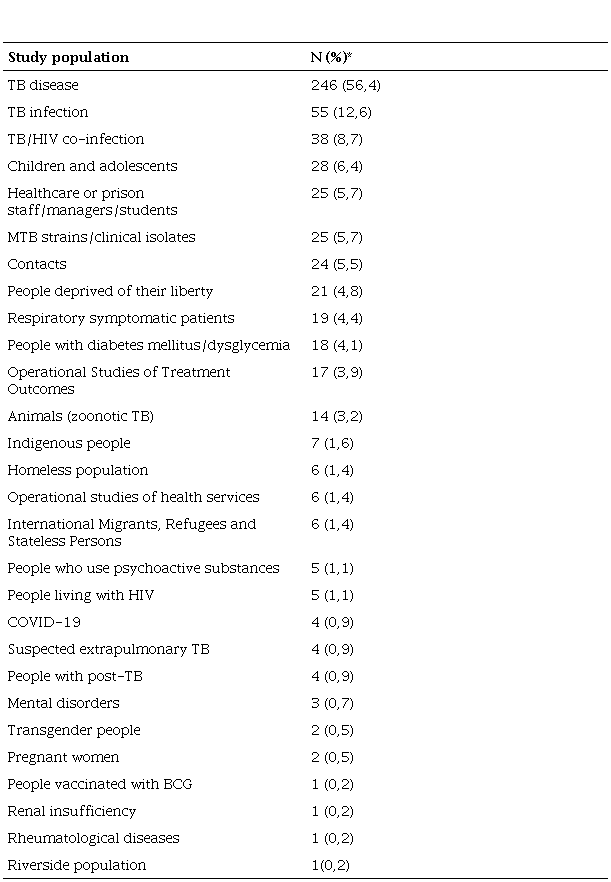 The studies covered a variety of populations, with the most frequent being people with TB “disease” (56.4%). People with TB infection were addressed in 55 (12.6%) studies and co-infection with HIV was the subject of 38 (8.7%) studies. Other populations addressed by the studies can be identified in (Table 3).