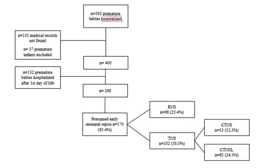 Sepsis was categorized as presumed early-onset neonatal sepsis (PES) when clinical signs and symptoms compatible with the disease occurred, and an antimicrobial regimen was initiated. Confirmed early-onset neonatal sepsis (CNS) was considered if a positive blood culture was obtained. PES was divided into rule out neonatal sepsis (RNS), whose clinical and laboratory evolution allowed the suspension of antibiotics within four days, and treated neonatal sepsis (TNS), which were those who received the antimicrobial regimen between five days and more.16