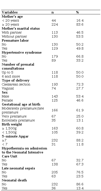 For the present study, 268 premature infants were included. Concerning maternal characteristics, most mothers were over 20 years old, lived without a partner and evolved to cesarean delivery. In relation to the characteristics of premature infants and neonatal care, the majority were male, classified as moderate/late premature, weighed over 1,500 g, had a 5-minute Apgar score greater than or equal to 7 and were hypothermic upon admission to the NICU (Table 1).