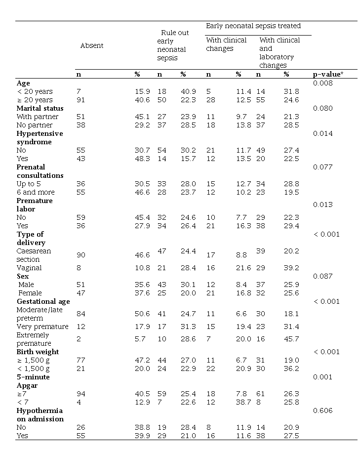 Among the limitations of this study, retrospective design with possible information bias, in addition to not obtaining some important maternal variables for the outcome studied, such as time of rupture of amniotic membranes, status of colonization by EGB, use of antimicrobial agents by the mother and diagnosis of chorioamnionitis, stood out.