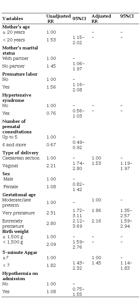 The bivariate analysis of the variables in chunk I demonstrated a higher risk for TNS in mothers under 20 years of age, who lived without a partner, who developed premature labor and who had a vaginal delivery. And a protective factor for the outcome included mothers with some hypertensive syndrome during pregnancy and who had six or more prenatal consultations. Regarding the variables in chunk II, a positive association, gestational age less than 32 weeks, birth weight less than 1,500 g and 5-minute Apgar score less than 7 were evidenced.