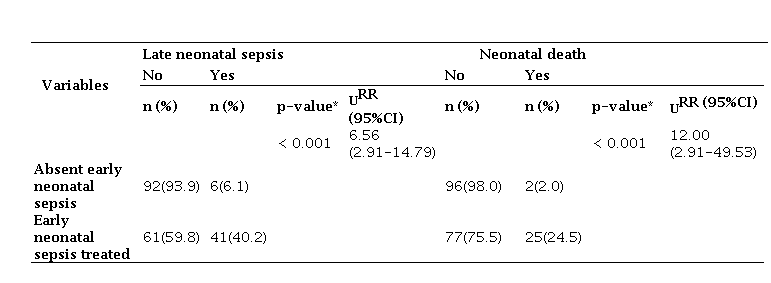 For the bivariate analysis, the early neonatal sepsis variable was recategorized as absent and treated (CTNS and CTNSL). The RNS category was removed from the analyses due to its behavior being different from the other sepsis categories (absent or TNS) and the insufficient number of observations for an analysis as an isolated category. The assessment of the progression to late neonatal sepsis and death was performed according to the groups of absent and treated early neonatal sepsis. Bivariate analysis between independent variables and treated early neonatal sepsis was performed using Poisson Regression with robust variance, obtaining estimates of the unadjusted Relative Risk (uRR) and their respective 95% Confidence Intervals (95%CI).