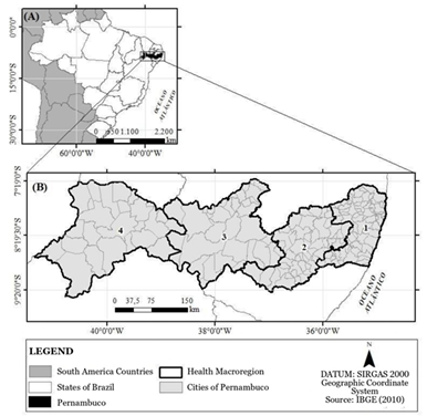 In compliance with the principle of decentralization of health actions proposed by the Brazilian Health System (In Portuguese, Sistema Único de Saúde - SUS), Pernambuco is subdivided into four Interstate Health Macroregions (IHM): Metropolitan Region; Agreste; Sertão; and Vale do São Francisco and Araripina (Figure 1). These territorial arrangements bring together more than one health region, with the aim of agreeing on interregional actions, services and interests, constituting an example of coordination at various levels beyond borders.10
