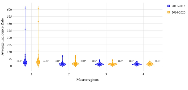 It can be seen that Pernambuco is moving in the opposite direction to other states in the northeast. Although far from achieving the SDGs, in Ceará, for a similar period, a decrease in incidence rates was observed, even though the problematic issue of the concentration of the highest rates in the MR remains.18In Paraíba, spatially similar findings were observed for the same period in the population under 15 years of age.19For the North region, a study carried out in Belém (PA) showed an incidence of 97.5/100 thousand inhabitants, well above the national average.20