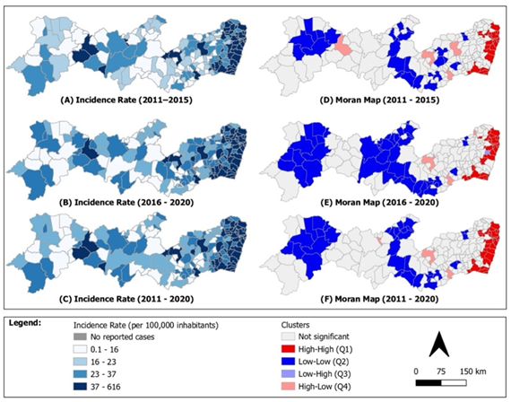 The letters D, E and F represent the Moran map of the TB incidence rate. One can see the existence of high-high clusters in the MRR and surrounding areas. Low-low clusters tend to be concentrated in the Sertão region of Pernambuco, which is home to MR 3 and 4 (Figure 3).