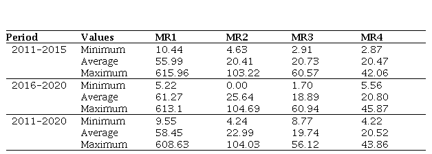 The highest ranges in TB detection rates are found in MR 1 (10.44–615.96 per 100,000 inhabitants), and the lowest in MR 3 (1.70–60.00 per 100,000 inhabitants). In the first five-year period, 50% of municipalities in MR 1 had up to 38.3 cases/100,000 inhabitants, rising to 44.95 in the second. This increase between periods was accompanied by all other MR. It is also observed that the median in MR 1 is higher than that of the others, showing that the problem is more present in this than in the other MR (Figure 2).