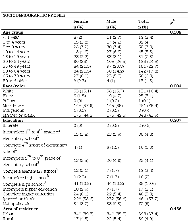 In relation to sex and race/color, mixed-race people were the most affected, specifically females (ᵪ² = 15.2; p = 0.004). The association between sex and age group (ᵪ² = 12.1; p = 0.208) and sex and education (ᵪ² = 9.4; p = 0.307) was not significant.