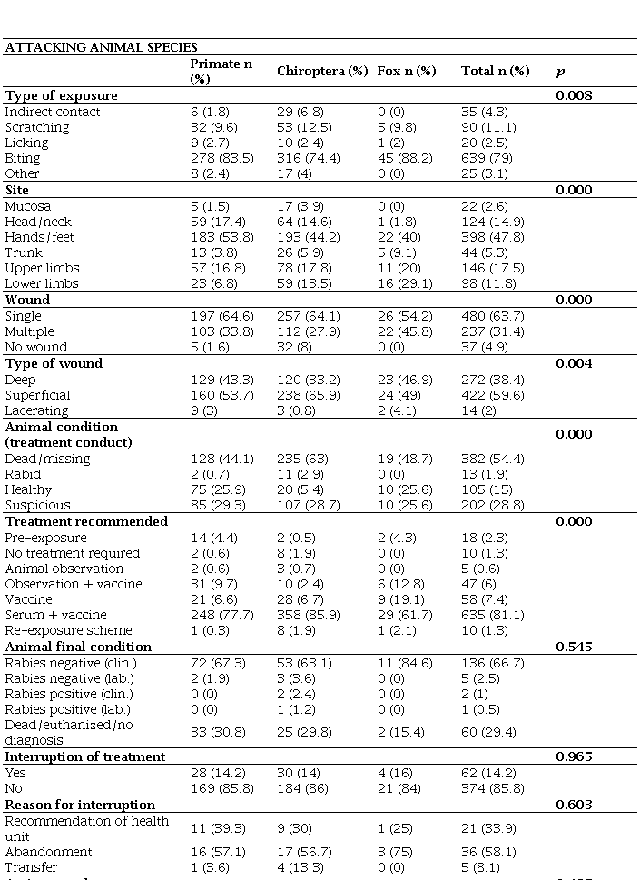 The type of exposure (ᵪ² = 20.6; p = 0.008), wound site (ᵪ² = 43.9; p = 0.000), wound (ᵪ² = 22.7; p = 0.000) and type of wound (ᵪ² = 15.5; p = 0.004) were statistically significant between species, as was treatment recommended (ᵪ² = 53.2; p = 0.000 (Table 2). Although biting was predominant in accidents involving the three species, scratching was also significant, followed by indirect contact, for bats, and licking, for primates and foxes. Hands and feet had the highest frequency of wounds, followed by upper limbs and head/neck in both bat and primate accidents, whereas lower limbs were the second most frequently reported site in fox accidents. Wound-free exposures were observed for both bats and primates.