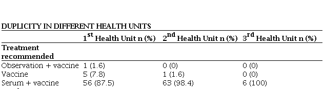 By qualitatively analyzing duplicate records, it was possible to identify that 64 cases of the same accident were reported in more than one health unit. The recommendation for treatment with serum and vaccine prevailed in the three care units. However, conducts classified as inadequate, such as observation and vaccine (1st unit - 1.6%) and only vaccine (1st unit - 7.8%; 2nd unit - 1.6%), were also recommended (Table 3).