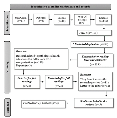 During the first phase of study selection, 171 articles were found, with 30 articles duplicates were excluded, and 113 articles were analyzed by title and abstract, of which 110 were research related to pathologies/health situations that differ from ICU reorganization, and three were reports and were excluded from the study. Twenty-eight were selected for full reading; 11 did not answer the research question, i.e. did not contain elements of ICU restructuring; and 12 were letters to the editor, leaving five studies selected for qualitative analysis (Figure 1).