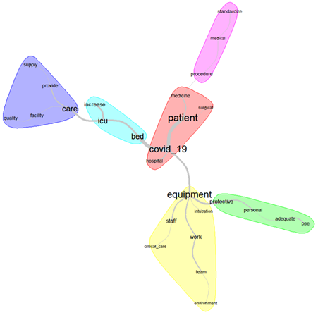Similarity analysis led to the composition of six core words, represented by the words COVID-19, patient, care, bed, ICU, and equipment. The branching among the six cores reveals how the terms are strongly interconnected and convey the notion of the aspects of resource management during the COVID-19 pandemic.