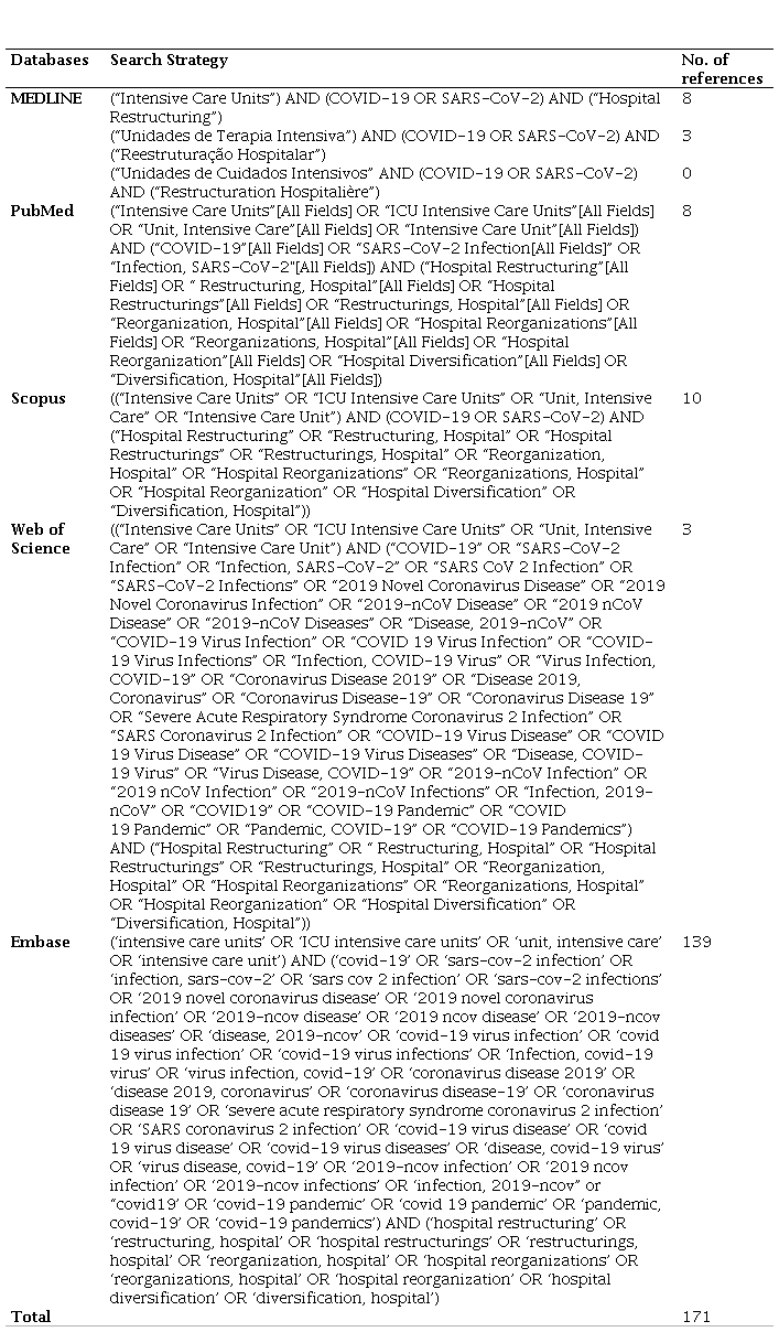 Studies with data on the structuring and restructuring of ICUs in terms of HR, MR, and organization/structure processes during the COVID-19 pandemic, published between 2019 and 2022 (justifying the time restriction by the discovery of the SARS-CoV-2 virus in 2019), records in English, Portuguese, and Spanish, available in full text, and published as original articles, were included. Review articles, commentaries, letters to the editor and non-peer-reviewed articles (in press) were excluded.