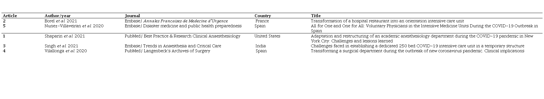 Most of studies were published in 202112,4,13, mainly in Spain13,14 and mostly indexed in Embase, in different journals. Regarding the identification of resources related to the reorganization of ICUs, the five studies showed significant responses within the definitions of resources described by Coppola5.