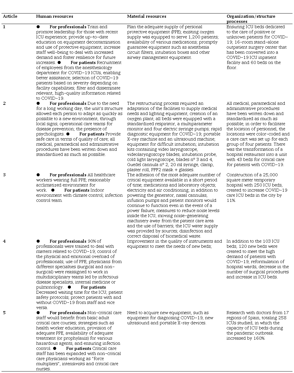 The main elements necessary for structuring and restructuring ICU to meet the pandemic scenario demands are HR: professional training to care for patients with COVID-19 and correct use of PPE, an increase in the number of healthcare professionals, an increase in strategies for team and patient well-being, relocation of professionals among care sectors, presence of psychologists in services to assist professionals and greater adherence to the use of PPE; MR: increased supply of adequate PPE, increased supply of oxygen, increased supply of medications and increased need for equipment such as anesthesia circuit filters, mechanical ventilators, intubation boxes and other equipment for airway management; and organization/structure processes: increased demand for hospitalization beds, including ICU, and adaptation of facilities for COVID-19 hospitalization sectors.