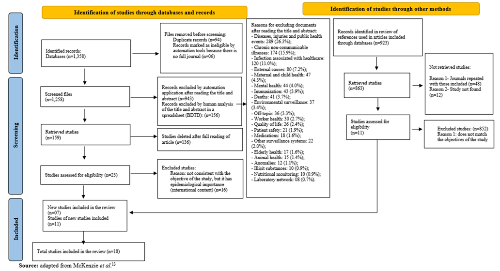 In order to identify studies through other methods and further refine the search, the bibliographic references of the seven studies included in database analysis were checked. Thus, we identified 923 bibliographic reference records. After analyzing these references, 11 studies that met the study objectives were eligible, as observed in the PRISMA flow diagram presented in Chart 2.