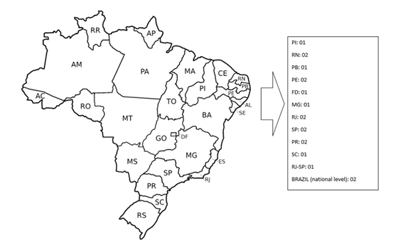 In accordance with the study objectives, 18 studies were included in this integrative review (Figure 2; Chart 3), which can therefore be distributed within the Federative Units (Figure 2).