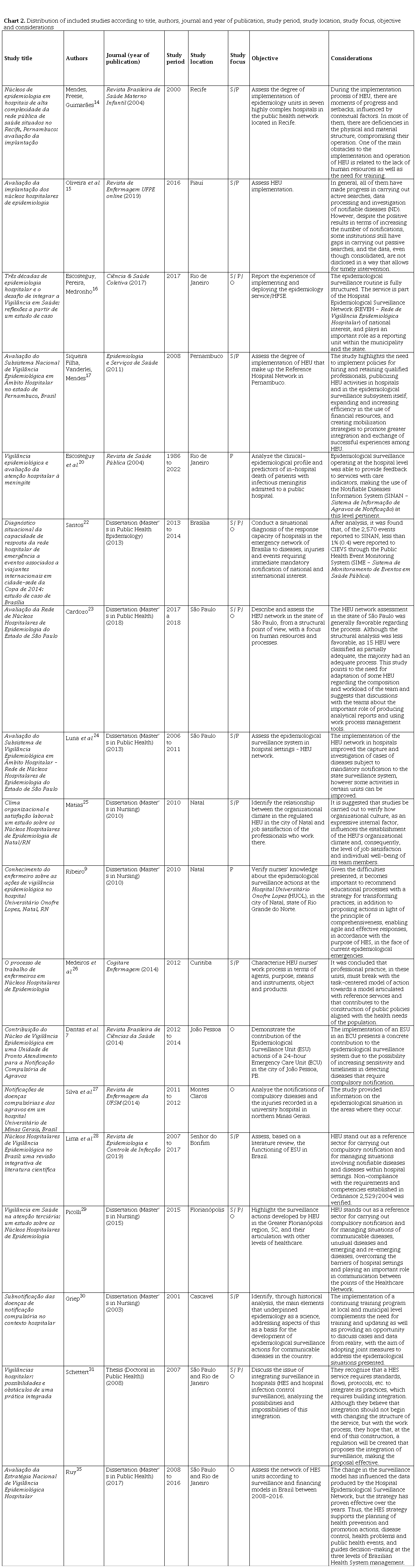 Abstract: Background and Objectives: the activities of epidemiological surveillance within hospital settings assume diverse structures and work processes according to different regions. This study aimed to map the studies conducted on the structure and/or processes of Hospital Epidemiology Units in Brazil. Methods: this is an integrative literature review conducted in the PubMed, Virtual Health Library (VHL), Brazilian Digital Library of Theses and Dissertations (BDTD), and CAPES Journals databases, using predefined descriptors. The search covered the period from 1971 to 2022. The construction of this study was guided by checklist items and the Preferred Reporting Items for Systematic Reviews and Meta-Analysis elaboration. The process of selecting and organizing study inclusion and exclusion was carried out through the Rayyan application. Results: eighteen studies were identified using controlled descriptors (Epidemiologic Surveillance Services; Hospitals; and Health Evaluation) in the selected databases, distributed across ten federal units. Regarding the searches for studies on Hospital Epidemiology Units, we came across studies on other subjects that do not necessarily provide information on the functioning or systematic nature of the organization. These studies present as their object, for instance, the illnesses reported by the unit. Conclusion: it was identified that the studies address topics such as notification and investigation of diseases and injuries, and active search. Some even verticalize analyses on integration between sectors within hospital settings and in the external care network. However, there are few studies that analyze the performance of the units – analysis of processes and outcomes.