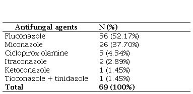 As for the number of medications per prescription, 98.55% (n=68) of these documents contained only one prescribed antifungal. The only association found was between tioconazole and tinidazole. The most prescribed antifungal agents were fluconazole (52.17%) and miconazole (37.7%) (Table 1).