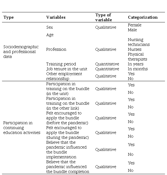 The dependent variable was knowledge of elements that make up the VAP prevention bundle (oral hygiene, elevated head of the bed, checking cuff pressure, possibility of extubation, daily awakening/reduction of sedation and adequate ventilation system maintenance). For each participant, the number of items that make up the bundle was counted, categorized as: knows up to three elements of the bundle and knows more than three elements of the bundle. Independent variables were divided into sociodemographic and professional data, and information related to participation in continuing education activities, detailed in Table 1.