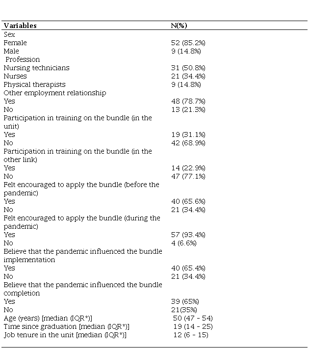 The study population consisted of professionals directly involved in the implementation of the actions that make up the VAP prevention bundle, such as nurses, nursing technicians and physical therapists. The sampling process for this study was by convenience, in which all ICU professionals were invited to participate, following the following inclusion criteria: having worked for more than five months in the unit and being part of the nursing or physical therapy team. Participants who responded less than 50% of the instrument were excluded. Of the 80 professionals eligible for the study, 71 agreed to participate; of these, ten were excluded due to incomplete completion of the instrument. Thus, the sample consisted of 61 professionals, representing 76.2% of the intended population.