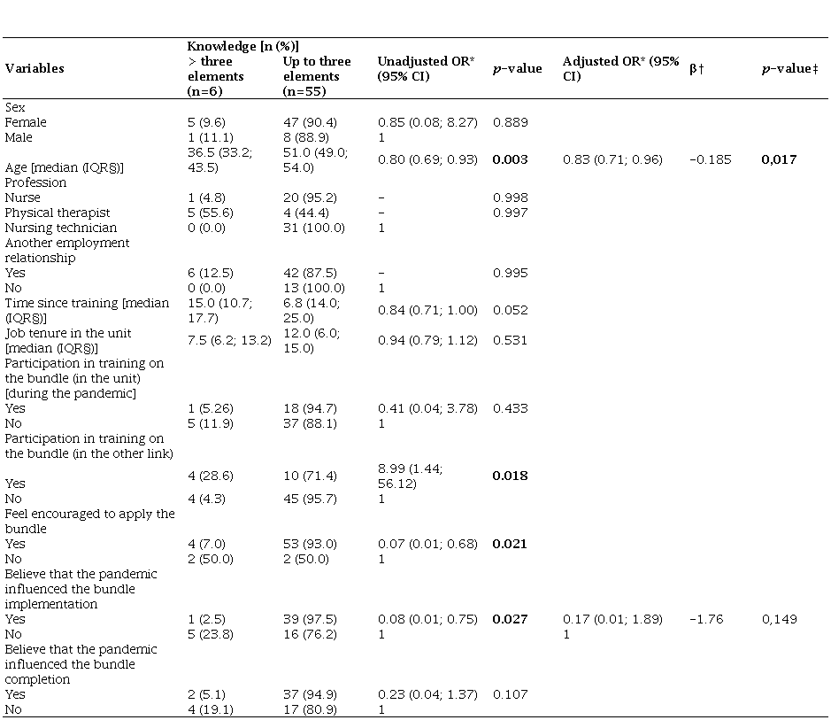 In relation to factors associated with knowledge of the bundle, bivariate analyses showed an association with age, participation in training on bundle V in the other employment relationship, feeling encouraged to apply the bundle and believing that the pandemic influenced the bundle implementation. In the multivariate analysis, only age remained statistically significant, showing that the younger the age, the greater the knowledge about the bundle (OR: 0.83; 95% CI: 0.71 – 0.96; p=0.017) (Table 3).