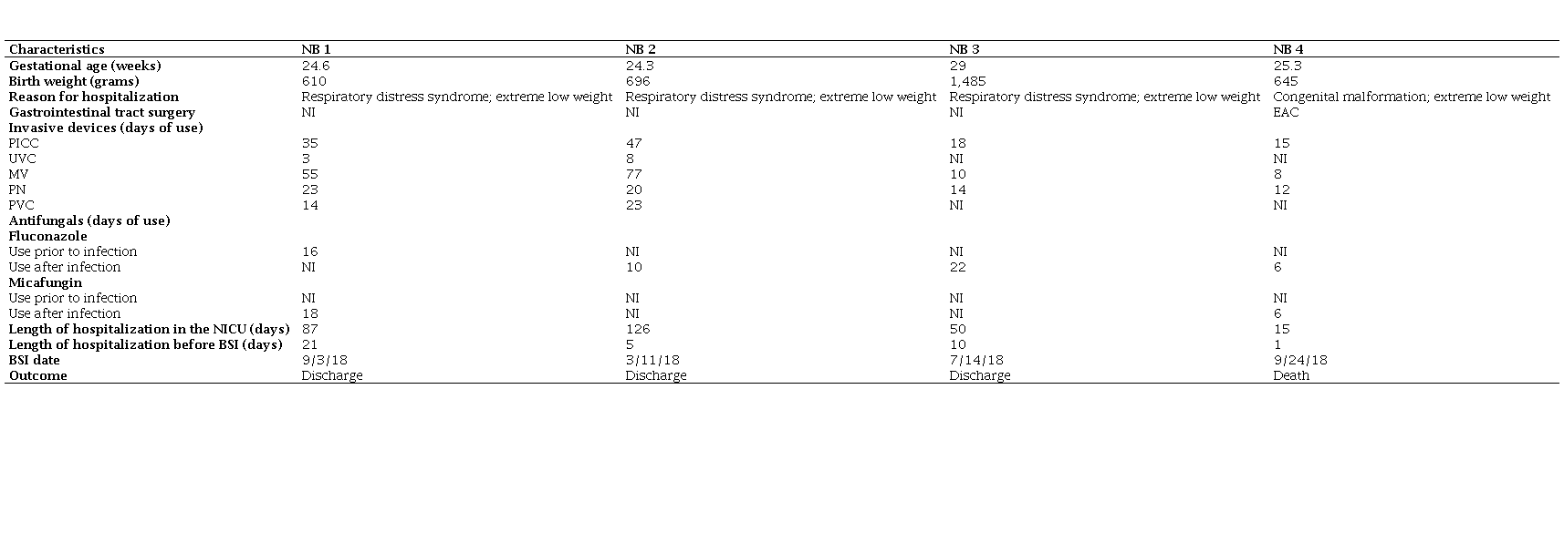 During the study period, seven NBs presented BSI, and of these, four were due to Candida species, such as Candida glabrata (NB 1), C. albicans (NB 2 and NB 3) and C. parapsilosis sensu stricto (NB 4). All NBs with Candida BSI were biological male, extremely premature (<29 weeks) and used at least one invasive device. The average length of hospital stay was 70 days, and the NB with C. parapsilosis sensu stricto infection died (Table 1).