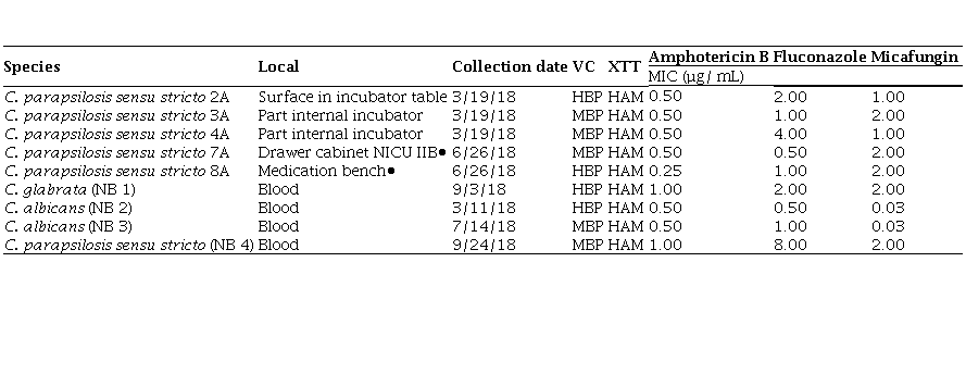 In this study we identified three Candida species causing IC in the four NBs (C. albicans, C. parapsilosissensu stricto and C. glabrata) and one in NICU environments (C. parapsilosis sensu stricto). The relationship between C. parapsilosis infections and NICU environments indicates the negative impact on NB survival, especially when inadequate hygiene measures contribute to the transmission of the pathogen microorganisms.2,3,9