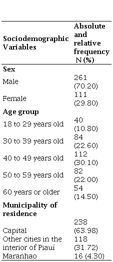 Of the 372 patients, most are male, representing 70.2% of the sample, while females represent 29.8%. The distribution by age group shows that most patients are in the age group 40 to 49 years (30.1%), followed by the group 30 to 39 years (22.6%) and 50 to 59 years (22.0%). Patients aged 60 years and older represent 14.5% of the sample, while the lowest proportion is in the 18-29 age group (10.8%). Regarding the municipality of residence, most patients live in the capital city of Teresina (63.98%), while 31.72% come from other cities in the interior of Piauí and 4.30% from the state of Maranhão (Table 1).