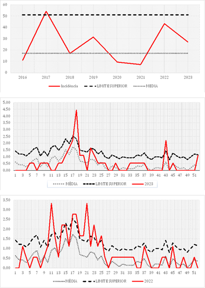 O diagrama de controle foi elaborado para analisar os níveis de risco de avanço da doença, com análise dos índices por ano (2016 a 2023) e posteriormente, dos níveis por semana epidemiológica (52) do biênio pós pandemia para verificar o padrão sazonal da doença no município.14