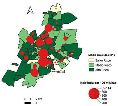 Para análise da concentração de casos, foi gerado um mapa cartográfico com a divisão dos bairros do município de Araguaína, no qual foram inseridas as informações sobre a incidência da doença. A incidência foi representada por meio da técnica de símbolos proporcionais, que ajusta o tamanho dos círculos de acordo com a densidade da ocorrência do fenômeno de interesse. Os valores do IIP por bairro foram representados coropleticamente, utilizando uma escala de cores conforme os diferentes níveis de risco. O software Quantum GIS (QGIS) foi utilizado na organização dos dados, análises espaciais e na geração do layout final do mapa, permitindo uma visualização clara e precisa das variáveis analisadas.