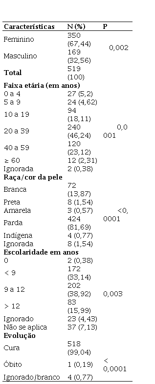 Quanto ao perfil epidemiológico, as mulheres tiveram maior incidência (67,43%), com maior percentual de casos ocorrendo em indivíduos pardos (81,69%), adultos jovens na faixa etária 20-39 anos (46,24%), com escolaridade máxima de nove a 12 anos (38,92%). Do total de casos confirmados, 99,03% evoluíram para cura (Tabela 1).