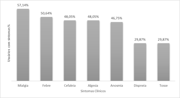 Uma pesquisa realizada em Wuhan, na China, constatou que os sintomas mais comuns nos primeiros dias de infecção por SARS-CoV-2 foram febre, tosse, dispneia e mialgia.6,20Esses dados são confirmados também em estudos brasileiros.21,22 De modo similar, esses sinais clínicos também foram os mais prevalentes em usuários da APS de Rondonópolis, com histórico de diagnóstico laboratorial para Covid-19. Além disso, uma parcela significativa da população estudada apresentou a anosmia e ageusia. Na fase inicial da pandemia, essas manifestações clínicas foram consideradas marcadores para rastreamento da doença, uma vez que estão ausentes em outras doenças respiratórias.23