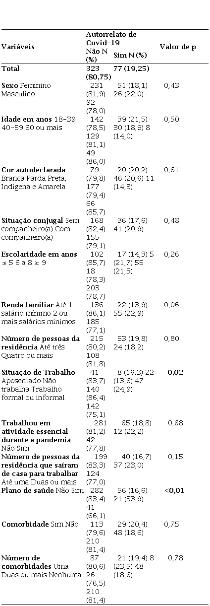Dos participantes do estudo, 77 relataram diagnóstico laboratorial de Covid-19, o que correspondeu a 19,25% da população estudada. A média de idade dos usuários com histórico de infecção por SARS-Cov-2 foi de 41,78 anos. No grupo de usuários com autorrelato de Covid-19, observou-se uma maior proporção de homens, indivíduos entre 18 e 39 anos, da cor parda, com companheiro, que estudaram por um período de cinco a oito anos, com renda de 2 ou mais salários mínimos e com até três residentes em casa. Uma maior probabilidade de autorrelato de diagnóstico laboratorial para Covid-19 também foi identificada em indivíduos que realizaram trabalho formal ou informal; naqueles que trabalharam em serviço essencial durante a pandemia; em indivíduos que moravam em residências nas quais duas ou mais pessoas precisaram sair para trabalhar; e naqueles que tinham plano de saúde (Tabela 1).