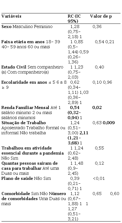 Os resultados evidenciaram que autorrelato de diagnóstico laboratorial de Covid-19 em usuários da ESF foi associado à renda (RC: 0,54; IC95%: 0,32 – 0,94), situação de trabalho (RC: 2,11 (1,21 – 3,68) e plano de saúde (RC: 0,39; IC: 0,21 – 0,71). As características sociodemográficas “apresentar menor renda” e “não ter plano de saúde” mostraram-se como fatores protetores para autorrelato de diagnóstico laboratorial de Covid-19, todavia, os indivíduos que realizaram trabalho formal ou informal durante a pandemia apresentaram 2,11 vezes mais chances de relatar histórico de Covid-19 (Tabela 2).