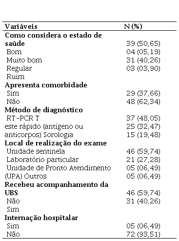 A maioria dos participantes da pesquisa que relataram ter recebido diagnostico considerou seu estado de saúde bom (50,65%) e não apresentou comorbidade (62,34%). O método de diagnóstico mais utilizado foi RT-PCR (48,05%), realizado nas unidades sentinelas (59,74%). Mais da metade dos usuários (59,74%) não recebeu acompanhamento pela Unidade Básica de Saúde, 93,51% não realizaram internação hospitalar e nenhum paciente foi internado em Unidade de Terapia Intensiva (Tabela 3).