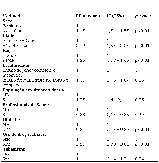O modelo de Poisson com variância robusta foi utilizado com as nove variáveis identificadas com p-valor < 0,20 na análise bivariada. Nesta análise, as variáveis significativas para o desfecho da coinfecção foram: o sexo masculino, que apresentou 47,5% de casos a mais em relação ao sexo feminino (RP = 1,45; IC95%: 1,34–1,56; p < 0,01); a idade, na faixa etária de 31 a 49 anos, que foi 58,4% maior do que a faixa etária acima de 60 anos, (RP = 2,12; IC95%; 1,35–2,28; p < 0,01); a raça parda, com 14,3% de casos a mais que a raça branca (RP = 1,26; IC95%; 0,98–1,45; p < 0,01); diabetes mellitus, com 21% de casos a mais em relação a pessoas que não possuem a comorbidade (RP = 0,22; IC95%; 0,17–0,28; p < 0,01); e o uso de drogas ilícitas, que apresentou 6,69% de casos a mais em relação à amostra de pessoas que não fazem uso dessas drogas (RP = 3,25; IC95%, 2,73–3,68; p < 0,01). Essas variáveis foram colocadas em negrito na coluna p-valor. (Tabela 2).