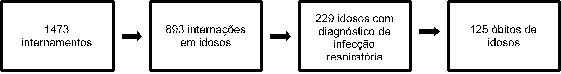 A população de estudo foi composta por idosos (≥ 60 anos), internados na UTI e com diagnóstico de infecção respiratória comunitária. Os prontuários dos pacientes com diagnóstico de infecção respiratória comunitária que evoluíram a óbito foram incluídos no estudo, excluíram-se os casos em que a infecção foi adquirida dentro do hospital tanto quanto foram identificados e excluídos os prontuários médicos repetidos e registros médicos duplicados a fim de garantir a fidelidade das informações. Aqueles com infecções relacionadas à assistência à saúde foram excluídas porque estudos sobre esse grupo já constituem uma literatura mais consolidada, além de envolverem determinantes e condicionantes diferentes.