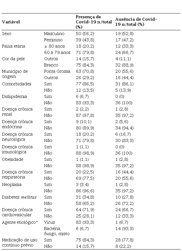 Dos pacientes com outras infecções respiratórias comunitárias (exceto a Covid-19), os dados mostram que a maioria era do sexo masculino (52,8%), na faixa etária dos 60 a 79 anos (66,7%), de pele branca (88,9%) e residentes em Ponta Grossa (PR) (55,6%). Observa-se que 31 (86,1%) indivíduos apresentavam morbidade crônica preexistente, entre elas a doença cardiovascular (66,7%), a doença respiratória (44,4%), o diabetes mellitus (27,8%) e doença neurológica (16,7%). Também, verificou-se que 28 (77,8%) utilizam medicamentos de uso contínuo (Tabela 1).
