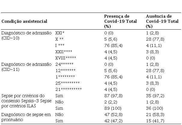 Quanto ao diagnóstico de sepse, observou-se que 47 (52,8%) não tinham diagnóstico médico no prontuário, porém, quando avaliou-se os pacientes com Covid-19 segundo os critérios diagnósticos ILAS e SOFA, 89 (100%) e 87 (97,8%), respectivamente, apresentaram os quesitos para sepse (Tabela 2).